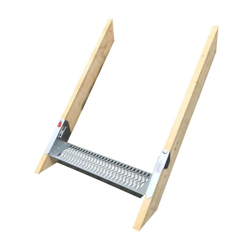 Kraftig galvaniseret kvalitet. Kan anvendes sammen med galvaniseret gelænderstolpe.Anvendelses områder: Til passage af skurvogne. Midlertidig trappe mellem arbejdsniveauer. Trappetrin som adgang til stilladser. Trappetrin til udgravninger. Midlertidig trappe til sociale arrangementer. Vægt 5,8 kg.